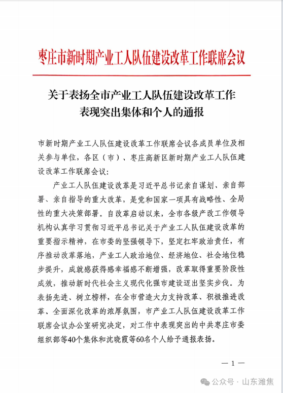 11月27日,棗莊市新時期產業(yè)工人隊伍建設改革工作聯席會議公布表彰名單,薛城能源公司榮獲“棗莊市產業(yè)工人隊伍建設改革工作表現突出集體”稱號。